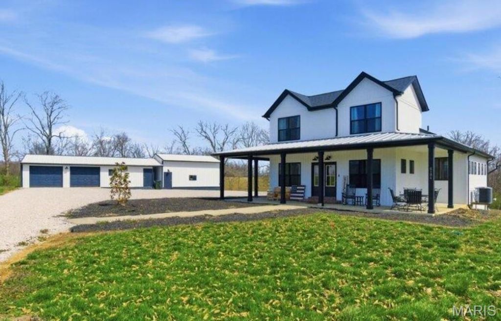Just the right amount of land to feel like your own private retreat without the burden of constant upkeep, this nearly new black-and-white modern farmhouse on 2 acres in rural Waterloo was designed for pure enjoyment. Offering 4 bedrooms, 3 baths, and over 2,300 finished square feet with additional lower-level space ready for your finishing touches, this home blends style and function beautifully. The wood-stamped concrete porch wraps three-quarters around the home and features recessed lighting and six electrical outlets, creating an ideal setting for seasonal dcor, grilling, or relaxing summer evenings. Inside, LVP flooring spans the main level, beginning in the spacious foyer with double farmhouse doors and flowing into the formal dining room and stunning kitchen with a massive island seating six, white shaker cabinetry, custom glass tile backsplash, and a walk-in pantry with an outlet for discreet appliance storage. The living room impresses with soaring 20-foot ceilings, an open staircase with rustic oversized newel posts, and an electric fireplace flanked by dual doors leading to a large stamped-concrete patio with TV mount and views of the new spring-fed pond with engineered overflow. The main floor includes a generous primary suite with walk-in closet and ensuite featuring a walk-in shower with white tile and black grout, double vanity, and center storage tower, plus a second main-floor bedroom ideal for guests or multigenerational living. A convenient side entry leads to the laundry room and half bath. Upstairs, a two-story catwalk overlooks the living room and connects bedrooms three and four, which share a Jack-and-Jill bath with double vanity, LVP flooring, and tub/shower combo. Additional highlights include zoned HVAC with independent room climate, a walk-out lower level with full egress window and bath rough-in, all-electric systems with propane plumbing available, and exceptional outbuilding space. The detached structure offers a pole-barn section with concrete floor and overhead doors large enough for an 18' camper, plus a garage area with two overhead doors, concrete flooring, space for three vehicles, and a workshop with abundant outlets. With thoughtful upgrades throughout and a setting that balances privacy with low maintenance, this modern farmhouse is ready to welcome you home. See listing information sheet with disclosures in the MLS for more info and upgrades.